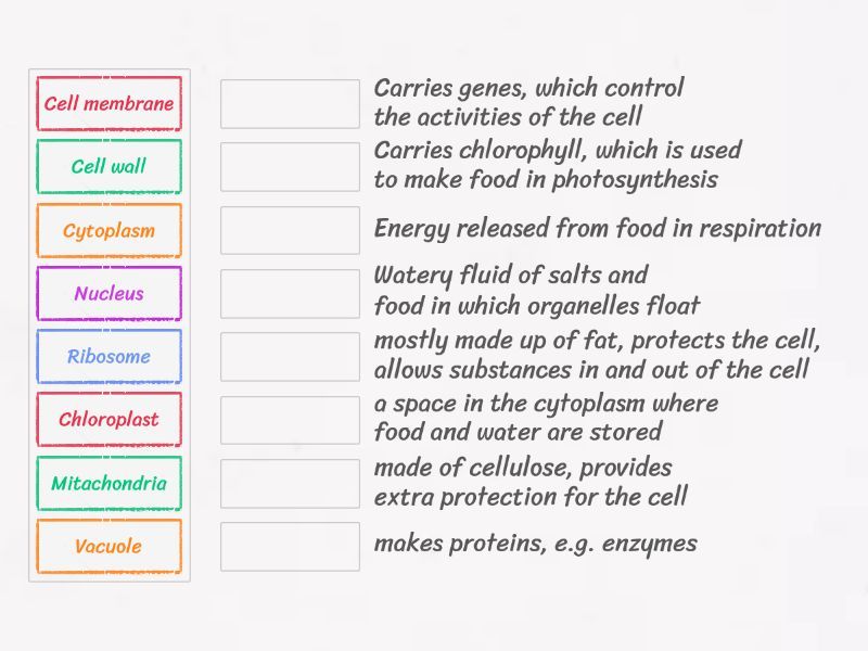 Cytoplasm - Watery fluid of salts and food in which organelles float, Mitachondria - Energy released from food in respiration, Nucleus - Carries genes, which control the activities of the cell , Vacuole - a space in the cytoplasm where food and water are stored, Cell wall - made of cellulose, provides extra protection for the cell, Cell membrane - mostly made up of fat, protects the cell, allows substances in and out of the cell , Ribosome - makes proteins, e.g. enzymes, Chloroplast - Carries chlorophyll, which is used to make food in photosynthesis,