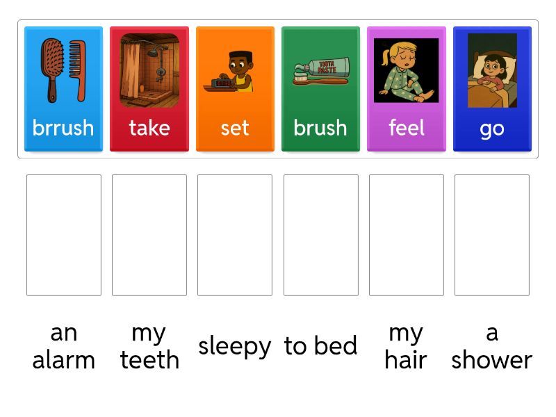 take - a shower, feel - sleepy, brush - my teeth, brrush - my hair, set - an alarm, go - to bed,