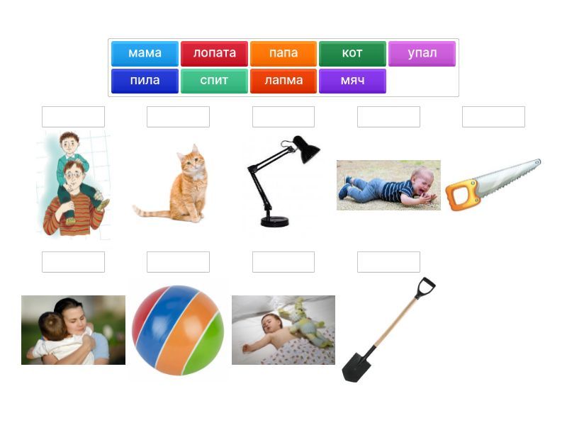 кот, мама, папа, мяч, лопата, лапма, пила, упал, спит,