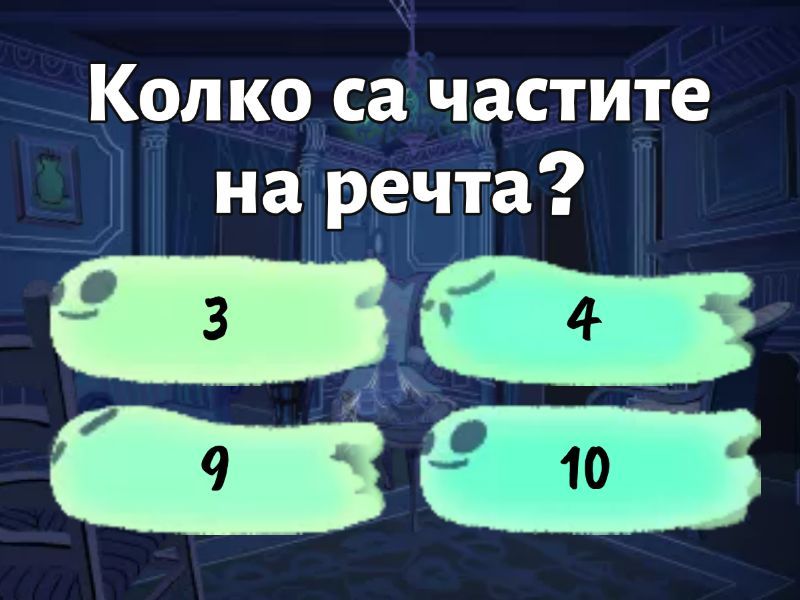 1) Колко са частите на речта? a) 3 b) 4 c) 9 d) 10 2) Кое е местоимението? a) ходя b) панта c) моя d) красива 3) Кое е възвратното лично местоимение? a) наш b) своя c) негов d) разхождам се 4) Къде има граматична грешка? a) къде сте решил да ходите b) много сте умна, госпожа c) какво сте направили, господине 5) Къде подлога е местоимение? a) Онзи не спира да ме гледа b) Искам тази чаша. c) Искам три от тези ябълки