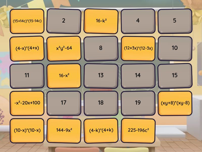 (4-x)*(4+x) - 16-x², (xy+8)*(xy-8) - x²y²-64, (10-x)*(10-x) - -x²-20x+100, (15+14c)*(15-14c) - 225-196c², (12+3x)*(12-3x) - 144-9x², (4-k)*(4+k) - 16-k², (25cd-3)*(25cd+3) - 625c²d²-9, (4+6f)*(4+6f) - 36f²+48f+16, (4-g)*(4+g) - 16-g², (1-k)*(1+k) - 1-k², (9-d)*(9+d) - 81-d², (3+a)*(3-a) - 9-a²,