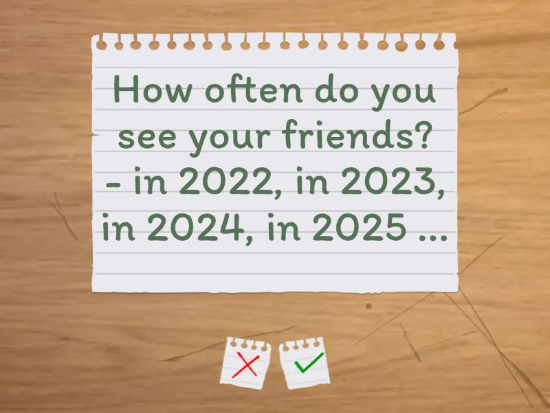 How often do you see your friends?- on Monday, on Tuesday, on Wednesday, on Thursday, on Friday, on Saturday, on Sunday - every day, How often do you see your friends? - week1, week 2, week 3 .... - every week, How often do you see your friends?- in January, in February, in March, in April, in May, in June, in July, in August, in September, in October, in November, in December - every month, How often do you see your friends? - in 2022, in 2023, in 2024, in 2025 ... - every year, How often do you see your friends? - only on Mondays - once a week, How often do you see your friends? - on Mondays and Wednesdays - twice a week, How often do you see your friends? - on Mondays, Wednesdays and Fridays - three times a week , How often do you see your friends? - in May, in July, in August and in December - four times a year,