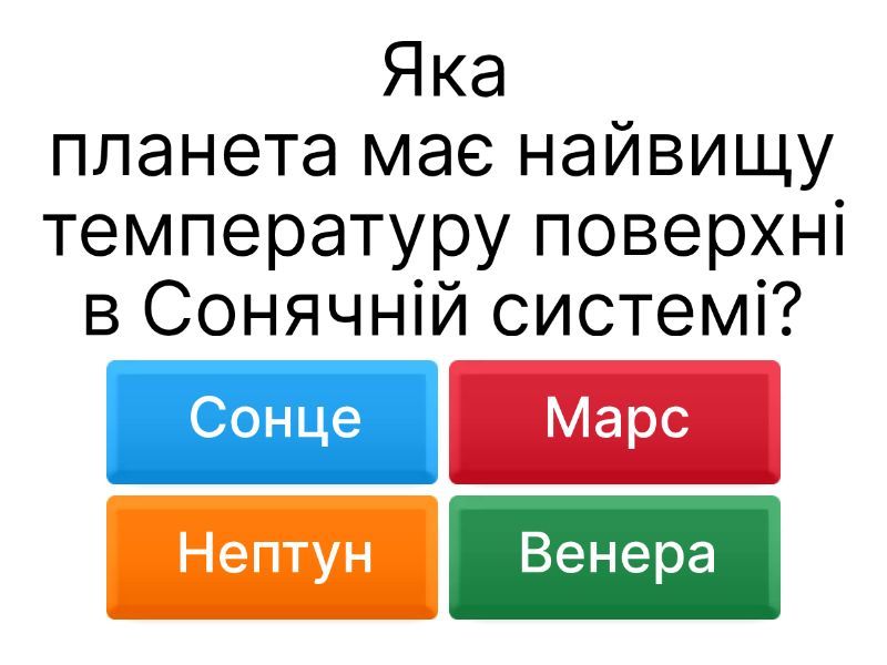 1) Яка планета має найвищу температуру поверхні в Сонячній системі? a) Сонце b) Марс c) Нептун d) Венера 2) Чому Місяць завжди повернутий до Землі одним боком? a) Через синхронне обертання b) Через те, що місяць не обертається навколо своєї осі c) Через вплив сонячного вітру d) Через різницю температур на його поверхні 3) Яка планета має найбільший у Сонячній системі вулкан - Олімп? a) Земля b) Венера c) Марс d) Нептун 4) Чому Земля є придатною для життя? a) Має нерухому поверхню без геологічних процесів b) Оптимальна температура, вода, атмосфера і магнітне поле c) Має повністю однорідну атмосферу d) Має найбільшу відстань від Сонця 5) Яка планета найбільш схожа за розміром на Землю, але має екстремальні умови? a) Плутон b) Нептун c) Марс d) Венера 6) Що спричинило утворення Місяця? a) Місяць сформувався самостійно b) Захоплення Місяця із пояса астероїдів c) Зіткнення молодої Землі з великим протопланетним тілом d) Утворення Місяця зі скинутого матеріалу Землі через швидке обертання