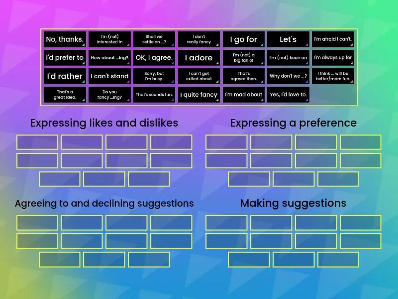 Expressing likes and dislikes: I quite fancy, I don't really fancy, I'm (not) a big fan of, I'm (not) keen on, I adore, I can't stand, I'm (not) interested in, I can't get exited about, I go for, I'm mad about, I'm always up for, Expressing a preference: I'd rather, I'd prefer to, I think ... will be better/more fun., Agreeing to and declining suggestions: Shall we settle on ...?, OK, I agree., That's agreed then., That's a great idea., That's sounds fun., Sorry, but I'm busy., Yes, I'd love to., I'm afraid I can't., No, thanks., Making suggestions: Do you fancy ...ing?, Why don't we ...?, How about ...ing?, Let's,