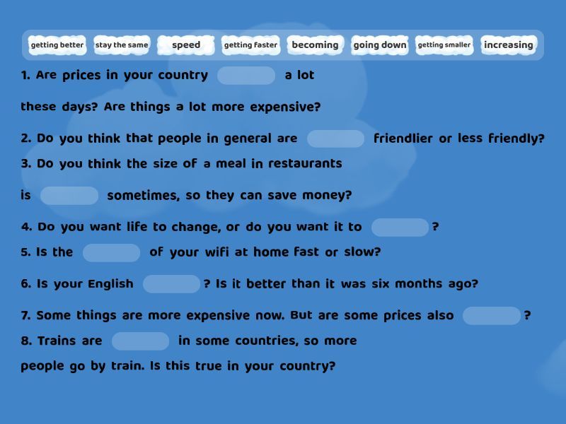 1. Are prices in your country ____ a lot these days? Are things a lot more expensive? 2. Do you think that people in general are ____ friendlier or less friendly? 3. Do you think the size of a meal in restaurants is ____ sometimes, so they can save money? 4. Do you want life to change, or do you want it to ____? 5. Is the ____ of your wifi at home fast or slow? 6. Is your English ____? Is it better than it was six months ago? 7. Some things are more expensive now. But are some prices also ____? 8. Trains are ____ in some countries, so more people go by train. Is this true in your country?