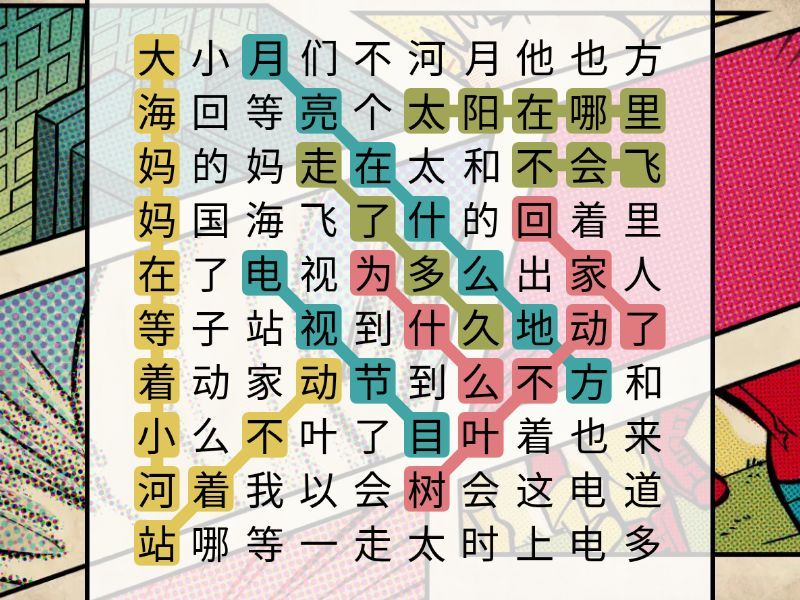树叶不动, 太阳在哪里, 月亮在什么地方, 站着不动, 为什么, 不会飞, 电视节目, 大海妈妈在等着小河, 回家了, 走了多久,