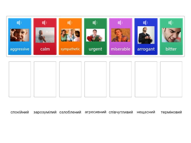 accusing - звинуваючий, aggressive - агресивний, arrogant - зарозумілий, bitter - озлоблений, calm - спокійний, complimentary - похвальний, enthusiastic - захоплений, grateful - вдячний, miserable - нещасний, nostalgic - ностальгічний, sarcastic - саркастичний, sympathetic - співчутливий, urgent - терміновий,
