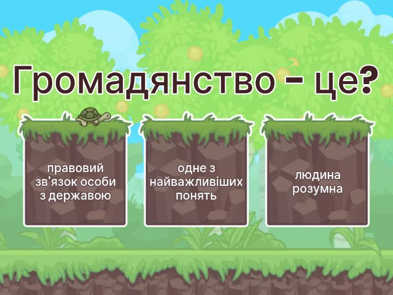 1) Громадянство - це? a) правовий зв'язок особи з державою b) одне з найважливіших понять c) людина розумна 2) Апатриди - це? a) громадяни b) особи без громадянства c) особи що мають два і більше громадянств 3) Біпатриди - це? a) держава b) апатриди c) особи що мають два і більше громадянств 4) Чи може в Україні особа без українського громадянства обиратися до органів державної влади? a) так b) ні c) дві відповіді правильні 5) В Україні існує єдине громадянство? a) так b) ні c) незнаю 6) З якого віку вихід із громадянства України дітей відбувається за їх згоди? a) 12 років b) 14 років c) 16 років 7) Громадянство України підтверджують певні документи, насамперед це? a) студенський квиток b) паспорт c) пенсійне посвідчення 8) Чи можна поновити громадянство України? a) як захоче Президент b) так c) ні 9) Набуття за правом крові та правом грунту - це набуття громадянства за a) народженням b) територіальним походженням c) результатом поновлення 10) Стійкий, юридично визначений, поза часом і простором, зв'язок людини з певною державою: a) конвенція b) права людини c) конституція d) громадянство