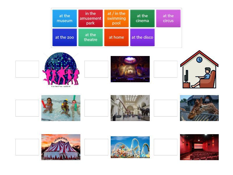 at the circus, at the disco, at the zoo, at home, at the theatre, at the cinema, at the museum, at / in the swimming pool, in the amusement park,