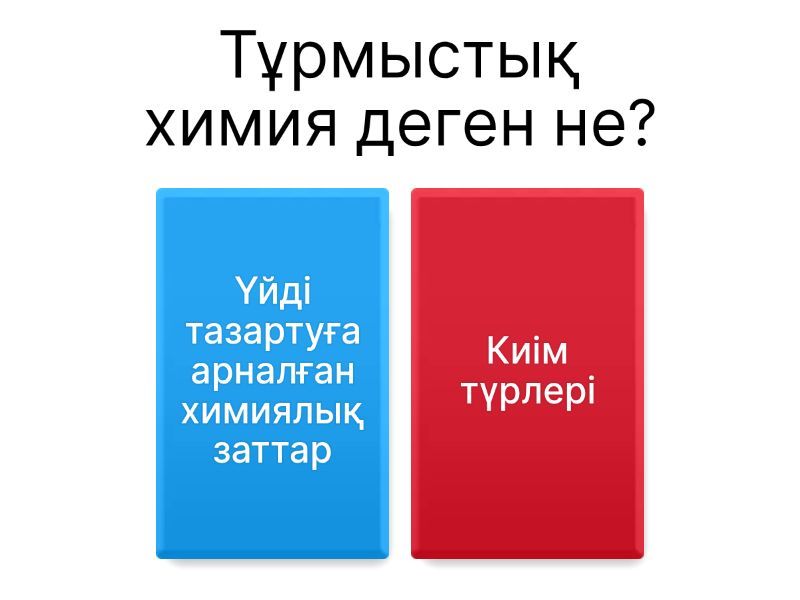 1) Тұрмыстық химия деген не? a) Үйді тазартуға арналған химиялық заттар b) Киім түрлері 2) Ыдыс жууға арналған құрал? a) Хлор b) Fairy (ыдыс жуғыш сұйықтық) 3) Тұрмыстық химия өнімдерінің қайсысы дезинфекциялайды? a) Шампунь b) Хлорлы ерітінді 4) Тұрмыстық химияны қайда сақтау керек? a) Балалардың қолы жетпейтін жерде b) Тоңазытқышта