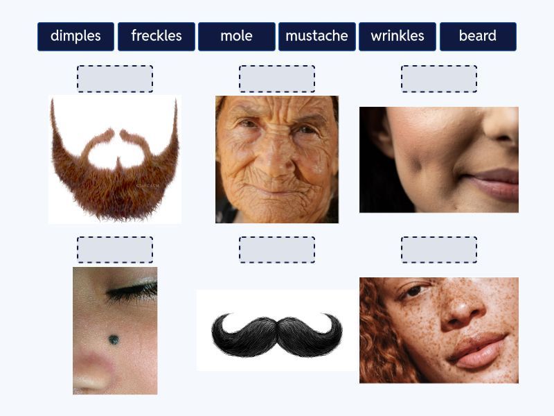 mustache , beard, wrinkles , freckles , mole, dimples,