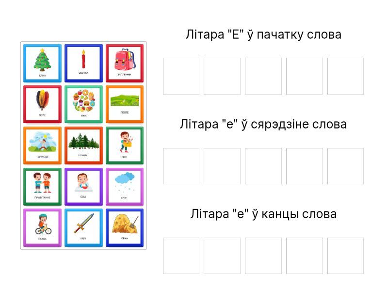 Літара "Е" ў пачатку слова: , , , , , Літара "е" ў сярэдзіне слова: , , , , , Літара "е" ў канцы слова: , , , , ,