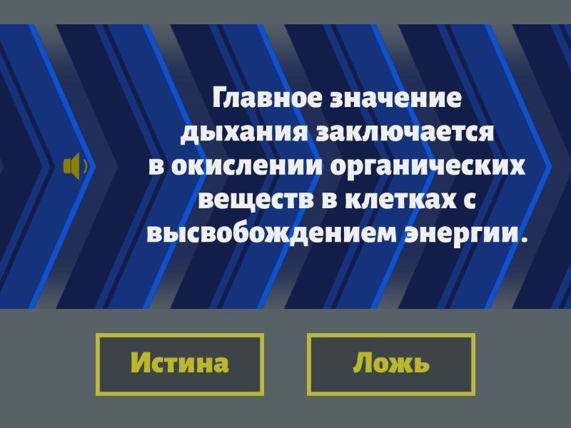Истина: Главное значение дыхания заключается в окислении органических веществ в клетках с высвобождением энергии., При легочном дыхании газообмен осуществляется между атмосферным воздухом и кровью, а при тканевом между кровью и тканями., Аэробный способ дыхания более эффективный, так как в процессе окисления глюкозы выделяется больше энергии, чем при анаэробном дыхании., Дыхание у растений осуществляется через устьица и чечевички., По артериям к органам и тканям кровь по большому кругу кровообращения доставляет кислород, а по венам выводит углекислый газ., Ложь: Во время дыхания организм поглощает углекислый газ и выделяет кислород., При аэробном дыхании организм может жить в бескислородной среде., К анаэробным организмам относятся дрожжи, кишечные паразиты, растения., Клеточное дыхание происходит в легких, Все живые организмы дышат легкими.,