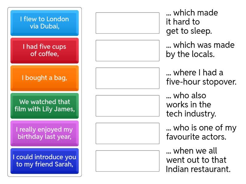 I grew up in Oreon, - ... which is a town in northern Spain., I could introduce you to my friend Sarah, - ... who also works in the tech industry., That song reminds me of our road trip, - ... when we kept playing that album over and over again., We went by double decker bus, - ... which is something I’ve wanted to do for ages., It’s a special cinema, - ... where the seats actually move., I went to that new exhibition by David Yarrow, - ... whose photographs of wildlife are amazing., I bought a bag, - ... which was made by the locals., I had five cups of coffee, - ... which made it hard to get to sleep., I flew to London via Dubai, - ... where I had a five-hour stopover., This is Daria, - ... whose brother is my neighbour., I really enjoyed my birthday last year, - ... when we all went out to that Indian restaurant., We watched that film with Lily James, - ... who is one of my favourite actors.,
