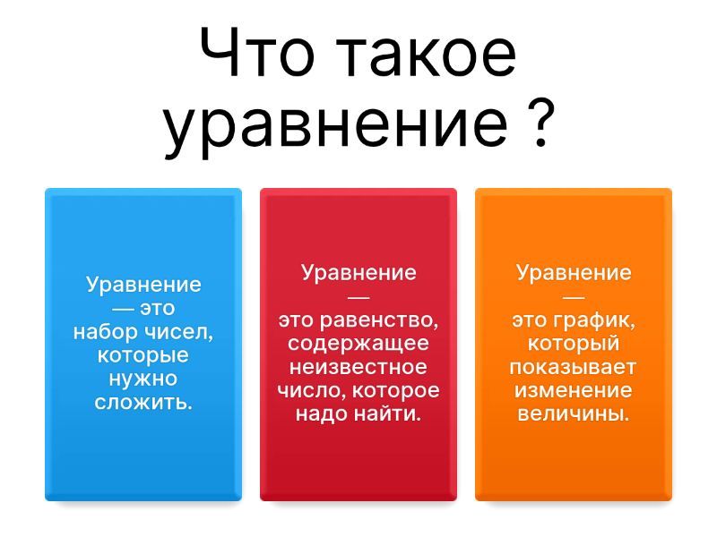 1) Что такое уравнение ? a) Уравнение — это набор чисел, которые нужно сложить. b) Уравнение — это равенство, содержащее неизвестное число, которое надо найти. c) Уравнение — это график, который показывает изменение величины.