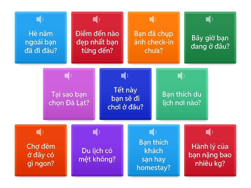 Bạn thích du lịch nơi nào? - Where do you like to travel? 🗺️, Bây giờ bạn đang ở đâu? - Where are you right now? 📍, Hè năm ngoái bạn đã đi đâu? - Where did you go last summer? 🏖️, Tết này bạn sẽ đi chơi ở đâu? - Where will you go this Lunar New Year? 🎉, Bạn thích khách sạn hay homestay? - Do you prefer hotels or homestays? 🏨🏡, Tại sao bạn chọn Đà Lạt? - Why did you choose Da Lat? 🌲, Chợ đêm ở đây có gì ngon? - What delicious food is there at the night market? 🌙, Hành lý của bạn nặng bao nhiêu kg? - How many kilograms is your luggage? 🧳, Bạn đã chụp ảnh check-in chưa? - Have you taken any check-in photos yet? 📸, Điểm đến nào đẹp nhất bạn từng đến? - What is the most beautiful place you’ve ever been to? ✨, Du lịch có mệt không? - Is traveling tiring? 😴,