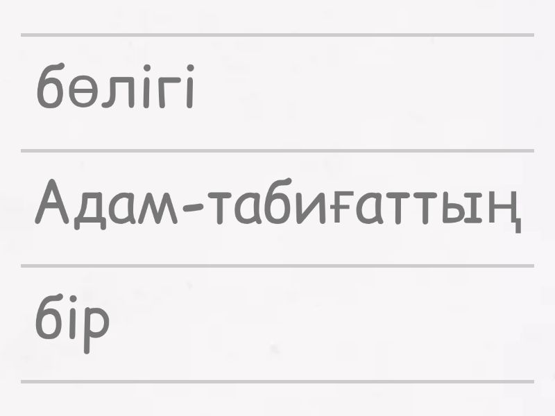 Адам-табиғаттың бір бөлігі, Су- тіршілік көзі, Ағаштар ауаны тазартады, Топырақ өсімдіктердің өсуіне қажет, Ай- жердің серігі, Жер- күн жүйесіндегі үшінші ғаламшар, Орман-көптеген жануарлардың мекені, Құстар ұя салады, Ай жерді айналады, Өсімдіктер оттек береді,