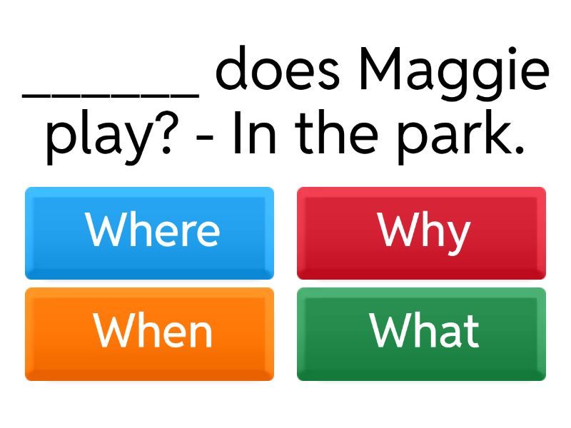 1) ______ does Maggie play? - In the park. a) Where b) Why c) When d) What 2) ______ do they watch TV? - In the evening. a) Where b) Why c) What d) When 3) ______ do the children get up at 10 o’clock? - Because they have holidays. a) When b) Where c) What d) Why 4) ______ does he like to eat? - Sandwiches. a) Why b) Where c) What d) When 5) ______ do Tom and Jerry live? - In the house. a) When b) What c) Where d) Why 6) ______ does Tom come home? - At eleven o’clock. a) What b) Where c) Why d) When 7) ______ does Bob go? - To school. a) What b) When c) Why d) Where 8) ______ is Tom ill? - Because he doesn’t do exercises. a) Why b) When c) What d) Where