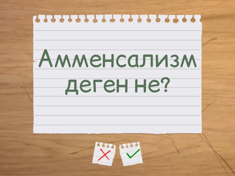 Антибиоз дегеніміз не? - Ағзалардың бір-біріне зиян келтіретін қарым-қатынасы., Бәсекелестік қандай жағдайда пайда болады? - Ортақ ресурсты бөлісе алмаған кезде., Жыртқыштықтың негізгі белгісі қандай? - Жыртқыштың жемтігін өлтіріп қоректенуі., Паразитизм дегеніміз не? - Паразиттің иесінде өмір сүріп, оған зиян келтіруі., Аллелопатия қандай ағзаларға тән? - Өсімдіктердің химиялық зат бөлу арқылы зиян келтіруі., Амменсализм деген не? - Бір ағза зиян көреді, екіншісі әсерсіз қалады., Паразитизмге мысал келтір. - Бүрге – ит.,