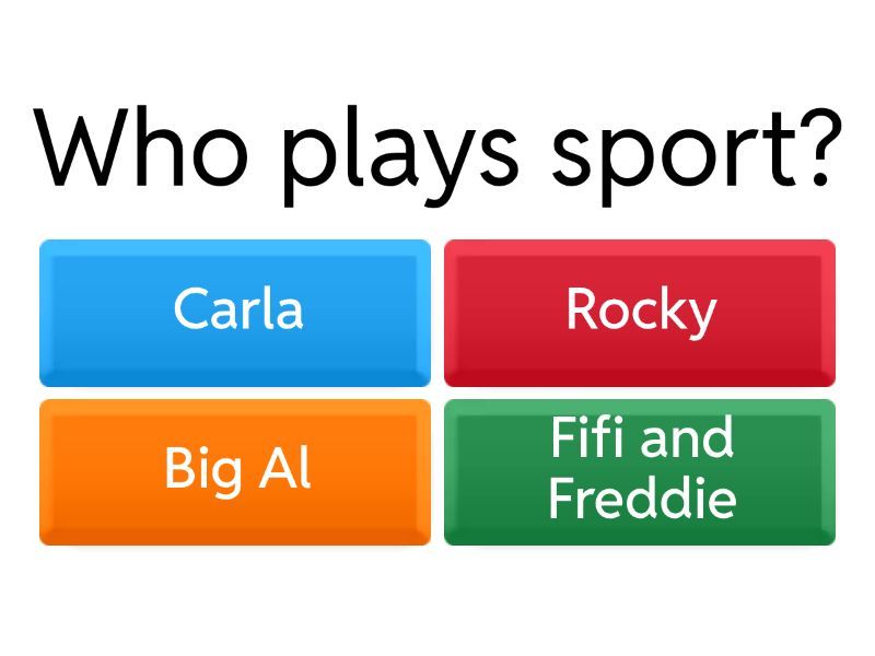 1) Who plays sport? a) Carla b) Rocky c) Big Al d) Fifi and Freddie 2) Who likes painting? a) Carla b) Big Al c) Rocky d) Fifi and Freddie 3) Who plays the guitar? a) Carla b) Big Al c) Fifi and Freddie d) Rocky 4) Who Does karate? a) Fifi and Freddie b) Rocky c) Big Al d) Carla 5) Who buy Big Al's picture? a) Rocky b) Carla c) Fifi and Freddie d) Big Al