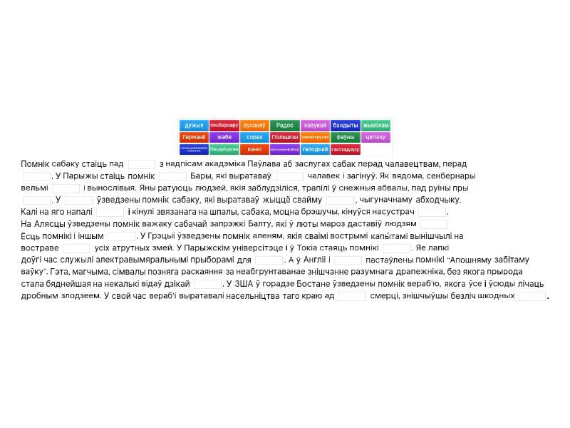Помнік сабаку стаіць пад ____ з надпісам акадэміка Паўлава аб заслугах сабак перад чалавецтвам, перад ____. У Парыжы стаіць помнік ____ Бары, які выратаваў ____ чалавек і загінуў. Як вядома, сенбернары вельмі ____ і вынослівыя. Яны ратуюць людзей, якія заблудзіліся, трапілі ў снежныя абвалы, пад руіны пры ____. У ____ ўзведзены помнік сабаку, які выратаваў жыццё свайму ____, чыгуначнаму абходчыку. Калі на яго напалі ____ і кінулі звязанага на шпалы, сабака, моцна брэшучы, кінуўся насустрач ____. На Алясцы ўзведзены помнік важаку сабачай запрэжкі Балту, які ў люты мароз даставіў людзям ____ Ёсць помнікі і іншым ____. У Грэцыі ўзведзены помнік аленям, якія сваімі вострымі капы́тамі вынішчылі на востраве ____ усіх атрутных змей. У Парыжскім універсітэце і ў Токіа стаяць помнікі ____. Яе лапкі доўгі час служылі электравымяральнымі прыборамі для ____. А ў Англіі і ____ пастаўлены помнікі “Апошняму забітаму ваўку”. Гэта, магчыма, сімвалы позняга раскаяння за неабгрунтаванае знішчэнне разумнага драпежніка, без якога прырода стала бяднейшая на некалькі відаў дзікай ____. У ЗША ў горадзе Бостане ўзведзены помнік вераб’ю, якога ўсе і ўсюды лічаць дробным злодзеем. У свой час вераб’і выратавалі насельніцтва таго краю ад ____ смерці, знішчыўшы безліч шкодных ____.