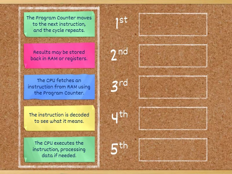 The CPU fetches an instruction from RAM using the Program Counter., The instruction is decoded to see what it means., The CPU executes the instruction, processing data if needed., Results may be stored back in RAM or registers., The Program Counter moves to the next instruction, and the cycle repeats..