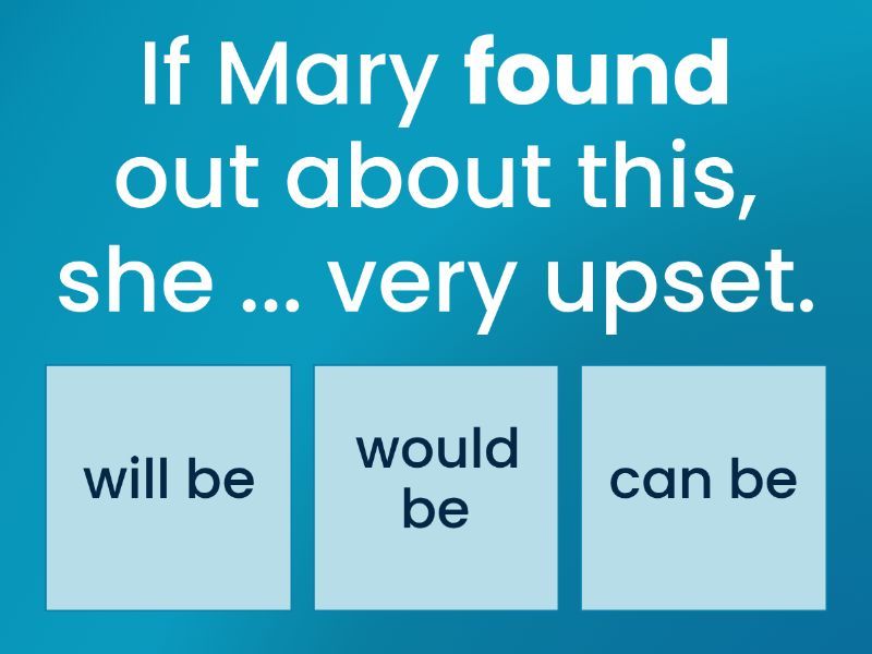 1) If Mary found out about this, she ... very upset.  a) will be b) would be c) can be 2) If you ... a little faster, we could get there by noon. a) will drive b) have drive c) drove 3) If I ... you, I’d invite Mary to my party. a) am b) were c) will be 4) If Gary ever went camping, he ... it difficult to survive. a) would find b) will find c) can find 5) If you ... to Antarctica, you would see lots of penguins.  a) go b) will go c) went 6) If I won a lot of money, I ... on a long holiday. a) would go b) will go c) went 7) If somebody ... Laura at school, she would talk to her parents about it. a) would bully b) bullied c) will bully 8) Bob... if he saw a snake. a) paniced b) will panic c) would panic 9) If Charlie had more money, he ... a house. a) bought b) would buy c) can buy 10) If I ... you, I would put some antiseptic cream on that scratch. a) was b) would be c) were