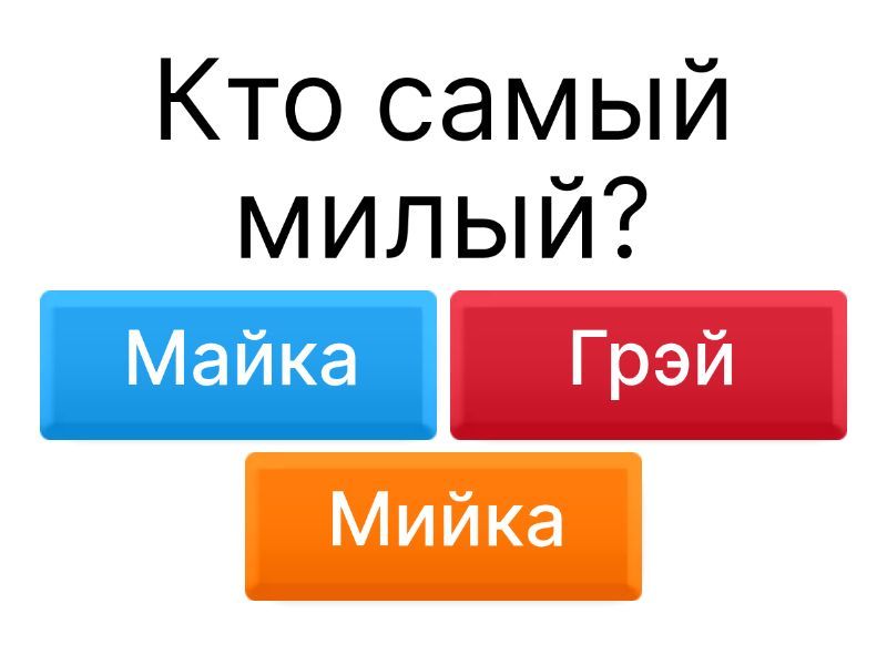 1) Кто самый милый? a) Майка b) Грэй c) Мийка 2) Кто является серым? a) Грэй b) Черныш c) Даня d) Вирсавия 3) Кто самый главный фанат Грэя? a) Ева b) Саша c) Тедди d) Дарина 4) Какого цвета Грэй? a) Серый b) Серо-буро малиновый c) Теддудёнок d) бульбульбульбуль 5) Какого цвета Саша? a) Чёрного b) Радужного c) хз не придумал d) Обыкновенного 6) Реши пример: Теддик + Грэй = ? a) Дружба b) Пуфыстики c) Животные d) Враги 7) Какой корм любит Грэй? a) Вискас b) Он ниче не любит c) Цезарь d) Вкусный 8) Что любит делать Грэй? a) Он любит нифига не делать b) Драться c) Скидывать вещи d) Обниматься 9) Сколько зубов у Грэя? a) Много b) Мало c) Недостаточно d) Теадор Захарович 10) Финальный вопрос: Грэй самый лучший? a) Да b) Конечно c) Однозначно d) Обязательно e) 100% f) Утвердительный ответ