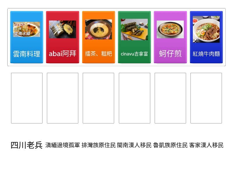 cinavu吉拿富 - 排灣族原住民, 蚵仔煎 - 閩南漢人移民, 擂茶、糍粑 - 客家漢人移民, abai阿拜 - 魯凱族原住民, 紅燒牛肉麵 - 四川老兵, 雲南料理 - 滇緬邊境孤軍,