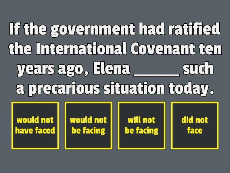 1) If the government had ratified the International Covenant ten years ago, Elena ______ such a precarious situation today. a) would not have faced b) would not be facing c) will not be facing d) did not face 2) If the constitutional court ______ truly independent, they would have dismissed the baseless accusations weeks ago. a) had been b) is c) were d) would be 3) If the activists ______ so effectively in the past weeks, the outcome might be very different right now. a) did not mobilize b) had not mobilized c) would not mobilize d) have not mobilized 4) If Elena ______ guilty of a real crime, she would not have fought so hard for a public trial last month. a) were b) had been c) would be d) is 5) If I ______ the lottery ticket yesterday, I would be a millionaire right now. a) bought b) had bought c) have bought d) would buy 6) If she spoke fluent Spanish, she ______ the job offer in Madrid last week. a) would accept b) will accept c) would have accepted d) accepted 7) If we ______ the map earlier, we wouldn't be lost in the middle of nowhere now. a) check b) had checked c) would check d) checked 8) If he ______ afraid of flying, he would have traveled to Hawaii with us last summer. a) weren't b) hadn't been c) isn't d) wouldn't be 9) If I ______ up so late last night, I wouldn't be so tired this morning. a) didn't stay b) haven't stayed c) hadn't stayed d) wouldn't stay 10) If I were you, I ______ that rude email to the boss yesterday. a) wouldn't send b) wouldn't have sent c) didn't send d) hadn't sent 11) If the student had studied for the final exam, he ______ happy with his grade today. a) will be b) would have been c) would be d) was 12) If he ______ a good driver, he wouldn't have crashed the car into the fence. a) had been b) were c) is d) would be