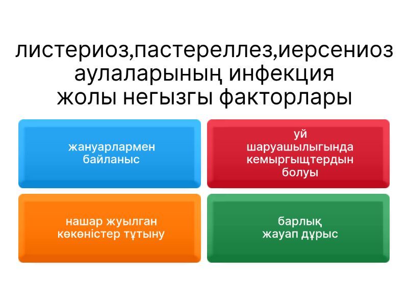 1) листериоз,пастереллез,иерсениоз аулаларының инфекция жолы негызгы факторлары a) жануарлармен байланыс b) уй шаруашылыгында кемыргыщтердын болуы c) нашар жуылган көкөністер тұтыну d) барлық жауап дұрыс 2) зоонозды инфекция дегенымыз? a) адамнан адамга гана жугатын ауру b) жануалардан адамға жұғатын инфекция c) тұқым қуалайтын ауру d) вирустық емес ауру 3) аса қауыпты инфекцияларга тән белгы a) жеңіл өтуі b) жоғары өлім-жітім c) тек балалар ауырады d) созылмалы турде ғана өтуі 4) құтыру ауруы қалай жұғады? a) ауа арқылы b) тағам арқылы c) жануар тістегенде d) су арқылы 5) аса кауыпты зоонозды инфекциялар анықталганда: a) үйде емделеді b) халыктык ем колдану c) ем қажет емес d) міндетты турде оқшауланады 6) аса қауыпты зоонозды инфекцияларға кайсысы жатады? a) қызылша b) тырысқақ c) оба d) сіреспе