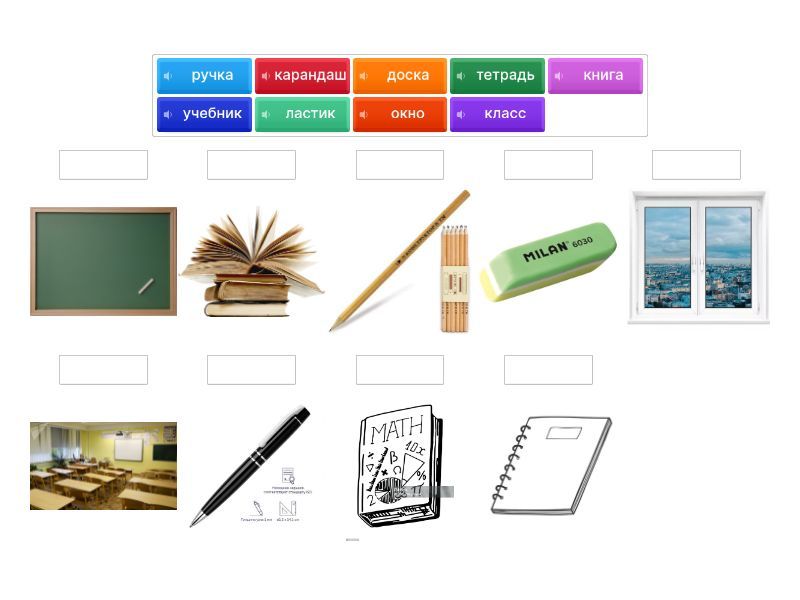 ручка, карандаш, ластик, тетрадь, доска, окно, учебник, книга, класс,