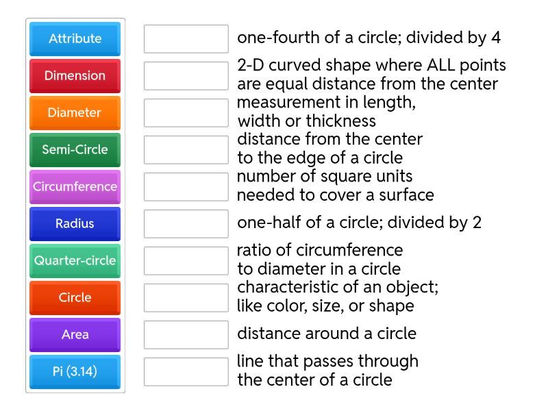 Attribute - characteristic of an object; like color, size, or shape, Area - number of square units needed to cover a surface, Pi (3.14) - ratio of circumference to diameter in a circle, Semi-Circle - one-half of a circle; divided by 2, Dimension - measurement in length, width or thickness, Circle - 2-D curved shape where ALL points are equal distance from the center, Circumference - distance around a circle , Diameter - line that passes through the center of a circle, Radius - distance from the center to the edge of a circle, Quarter-circle - one-fourth of a circle; divided by 4,