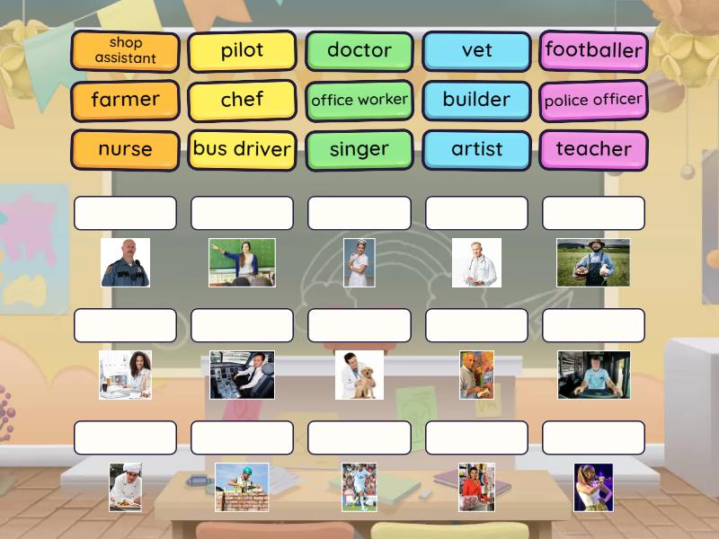artist, builder, bus driver, chef, doctor, farmer, footballer, nurse, office worker, pilot, police officer, shop assistant, singer, teacher, vet,