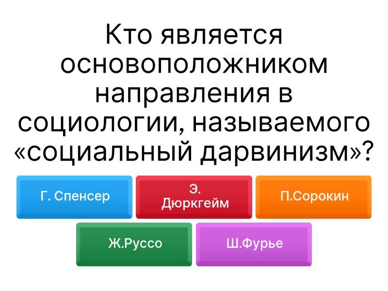 1) Кто является основоположником направления в социологии, называемого «социальный дарвинизм»? a) Г. Спенсер b) Э. Дюркгейм c) П.Сорокин d) Ж.Руссо e) Ш.Фурье 2) Заслуга К. Маркса в становлении социологии: a) Теория общественно-экономических формаций b) Открытие теории прибавочной стоимости c) Критика Гегеля d) Научный анализ современного ему капиталистического общества e) Является основоположником марксизма 3) Одна из концепций культуры состоит в понимании ее творческой деятельности. Эта концепция нашла отражение в работах: a) М. Иовчука, Л. Коган b) В. Давидовича, Э. Маркаряна; c) Э. Баллера, В. Межуева, Н. Злобина d) А. Уледова e) Е. Вавилова, В.Фафанова 4) Вопрос: Работа О.Конта … a) «Курс правильной философии» b) «Курс правдивой философии» c) «Курс позитивной философии» d) « Аномия» e) «Самоубийство» 5) Выберите направление в социологии, которое исходит из положения, что новое «положительное» знание должно быть свободно от всяких домыслов, опираться на естествознание: a) понимающая социология b) позитивизм c) интеракционизм d) этнометодология e) экзистенциализм 6) Социальная стратификация это: a) структурированное неравенство между различными группами людей b) различия между людьми c) разделение людей по странам d) разделение людей по нациям e) разделение между городом и селом 7) Социальное неравенство, основанное на этнической принадлежности называется a) расизм b) национализм c) патриотизм d) фашизм e) интернационализм 8) Процесс определения и закрепления социальных норм, правил, статусов и ролей, приведение их в систему: a) Маргинализация b) Институционализация c) Социализация d) Адаптация e) Инфильтрация 9) Место, позиция, положение человека в обществе a) должность b) статус c) роль d) занятие e) профессия 10) Статус состоит из… a) должностей b) ролей c) занятий d) профессий e) предписание морали 11) Модель поведения в соответствии с правами и обязанностями, соответствующая социальным нормам (культурE. данного общества a) норма b) профессия c) занятие d) должность e) роль 12) Статусы возникают в соответствии с… a) должностными функциями b) социальными функциями c) обычаями d) традициями e) умением подчиняться требованиям 13) Главным фактором, который определяет процесс формирования личности, является: a) культура b) биологическая наследственность c) индивидуальный опыт d) экономика e) власть 14) В качестве типа культуры за функциональной ролью выступает: a) материальная культура. b) религиозная культура c) физическая культура d) народная культура e) общая культура 15) Форма закрепления и способ осуществления специализированной деятельности, которая обеспечивает стабильное функционирование общественных отношений, называется, : a) социальная общность. b) социальный институт. c) социальная роль. d) социальная группа. e) социальный объект. 16) Моделью поведения в соответствии со статусом человека определяется: a) социальная роль. b) социальная функция. c) социальная ценность. d) социальный обычай. e) социальное действие. 17) Сообщество, с которым индивид соотносит себя как с эталоном в своем поведении, – это: a) диада группа b) референтная группа c) большая группа d) квазигруппа e) малая группа 18) Группа людей, между которыми почти отсутствуют эмоциональные связки, а их взаимодействие предопределено стремлением достичь определенной цели, это: a) вторичная группа b) малая группа c) первичная группа d) больша