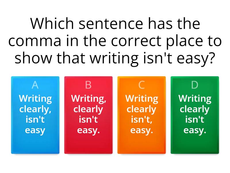 1) Which sentence has the comma in the correct place to show that writing isn't easy? a) Writing clearly, isn't easy b) Writing, clearly isn't easy. c) Writing clearly isn't, easy. d) Writing clearly isn't easy. 2) Which sentence has the comma in the correct place to show that legible writing isn't easy? a) Writing clearly, isn't easy. b) Writing, clearly isn't easy. c) Writing clearly isn't, easy. d) Writing clearly isn't easy. 3) Which sentence shows that the clown is saying the acrobat is an idiot? a) The acrobat said the clown was an idiot. b) The acrobat, said the clown was an idiot. c) the acrobat, said the clown, was an idiot. d) The acrobat said the clown, was an idiot. 4) Which sentence shows that the person definitely doesn't want to cook their dog? a) My hobbies are cooking dogs, singing and painting. b) My hobbies are cooking, dogs, singing and painting. c) My hobbies are cooking dogs singing and painting d) My hobbies are, cooking dogs, singing and painting. 5) Which sentence shows that the girl is improving a) The girl thinks the piano teacher is improving. b) The girl thinks the piano teacher, is improving c) the girl, thinks the piano teacher is improving. d) The girl, thinks the piano teacher, is improving. 6) Which sentence shows that Miss Vernon doesn't like dancing cupcakes? a) Miss Vernon likes dancing cupcakes and drawing. b) Miss Vernon likes dancing, cupcakes and drawing. c) Miss Vernon likes, dancing cupcakes and drawing. d) Miss Vernon likes dancing cupcakes, and drawing. 7) Which sentence shows that Tom is calling Sam to eat with him not to eat him? a) "Let's eat Sam!" exclaimed a hungry Tom. b) "Let's, eat Sam!" exclaimed a hungry Tom. c) "Let's eat, Sam!" exclaimed a hungry Tom. d) "Let's eat Sam!" exclaimed, a hungry Tom. 8) Which sentence shows that the manager isn't calling the ref names? a) "That's a foul, ref!" shouted the football manager. b) "That's a foul ref!" shouted the football manager. c) "That's a, foul ref!" shouted the football manager. d) That's a foul ref!" shouted, the football manager. 9) Which sentence shows that Daniel was not walking on his head? a) Daniel walked on his head throbbing in agony. b) Daniel walked on his head, throbbing in agony. c) Daniel walked on, his head throbbing in agony. d) Daniel walked on his, head throbbing in agony. 10) Which sentence shows that we definitely aren't going to cut and paste children? a) We're going to learn to cut and paste kids. b) We're going to learn to cut, and paste kids. c) We're going, to learn to cut and paste kids. d) We're going to learn to cut and paste. kids.