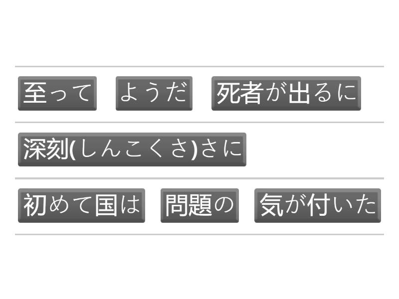 ひどい症状が 出るに 至っても 彼は病院へ 行こうと しなかった, 死者が出るに 至って 初めて国は 問題の 深刻(しんこくさ)さに 気が付いた ようだ, 病気の牛が 20万頭 処分されるに 至って やっとマスコミに 取り上げられる ようになった, 個人情報が ネットに流出する という事態(じたい)に 至っても 問題の重大さに 気が付かない 人もいる, 最近デパートの閉店が 相次いでいて Aデパートに 至っては すでに 三つの支店が 閉店した, 毎年この地方は 洪水の被害を 受けていて 長崎県に 至っては 今年もう 3回目だ, 息子は 遊んでばかりで まじめに働こうとせず やっと紹介できた 会社も 辞めてしまう 始末だ, 田中さんは お酒を飲んで 大きな声で しゃべり続けた後で ついに泣き出す 始末だった, 兄は 借金を返すために 家にある物を お金に換えて 父の時計まで 売ってしまう 始末だ, 昨日は エアコンを つけ っぱなしで 寝て しまった, 一日 立ち っぱなしの 仕事なので 足が 疲れる, 相手も 悪いのに 私だけ 言われ っぱなしで 何も 言い返せなかった,