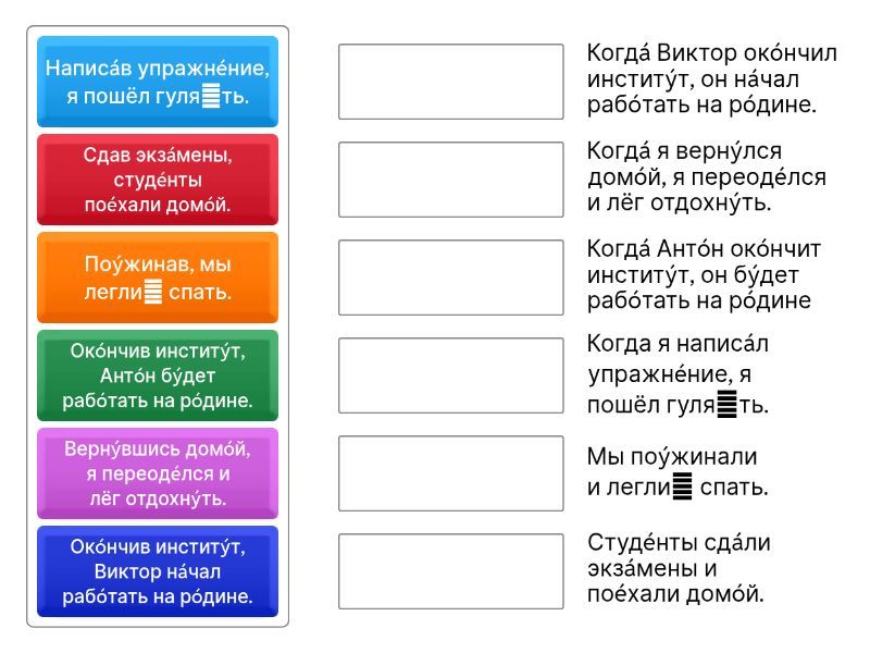Написáв упражнéние, я пошёл гуля́ть. - Когда я написáл упражнéние, я пошёл гуля́ть., Поýжинав, мы легли́ спать. - Мы поýжинали и легли́ спать., Сдав экзáмены, студéнты поéхали домóй. - Студéнты сдáли экзáмены и поéхали домóй., Вернýвшись домóй, я переодéлся и лёг отдохнýть. - Когдá я вернýлся домóй, я переодéлся и лёг отдохнýть., Окóнчив инститýт, Виктор нáчал рабóтать на рóдине. - Когдá Виктор окóнчил инститýт, он нáчал рабóтать на рóдине., Окóнчив инститýт, Антóн бýдет рабóтать на рóдине. - Когдá Антóн окóнчит инститýт, он бýдет рабóтать на рóдине,