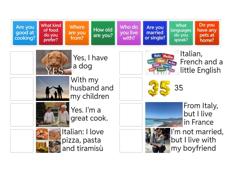 Where are you from? - From Italy, but I live in France, Are you good at cooking? - Yes. I'm a great cook., How old are you? - 35, Do you have any pets at home? - Yes, I have a dog , Who do you live with? - With my husband and my children, What kind of food do you prefer? - Italian: I love pizza, pasta and tiramisù, Are you married or single? - I'm not married, but I live with my boyfriend, What languages do you speak? - Italian, French and a little English,