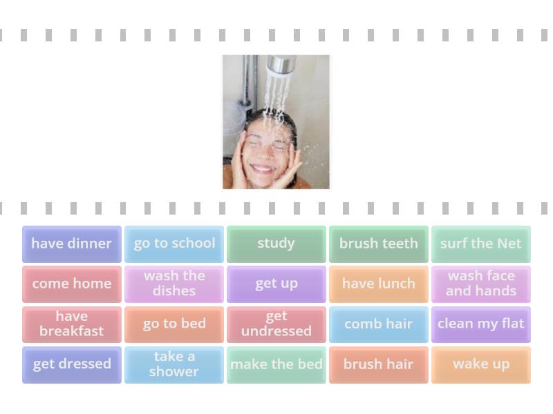 take a shower, have breakfast, have lunch, study, wash face and hands, have dinner, surf the Net, go to bed, get up, go to school, come home, wake up, brush teeth, wash the dishes, get dressed, make the bed, brush hair, clean my flat, comb hair, get undressed,