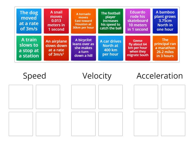 Speed: Eduardo rode his skateboard 10 meters in 1 second, The dog moved at a rate of 3m/s, A snail moves 0.013 meters in 1 second, The principal ran a marathon 26.2 miles in 3 hours, Velocity: A bamboo plant grows 3.75cm North in one hour, Geese fly about 64 km per hour when they migrate South, A car drives North at 400 km per hour, A tornado moves East toward Houston at 30km per hour, Acceleration: A train slows to a stop at a station, A bicyclist leans over as she makes a turn down a hill, An airplane slows down at a rate of 3m/s2, The football player increases his speed to catch the ball,