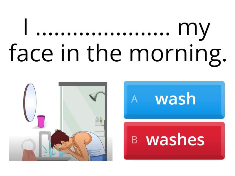 1) I ...................... my face in the morning.  a) wash b) washes 2) My friend ...................... on the computer every evening. a) play b) plays 3) I ...................... at school every day . a) study b) studies 4) He ...................... every morning at 7.00. a) get up b) gets up 5) My friends ...................... to music every day. a) listen b) listens