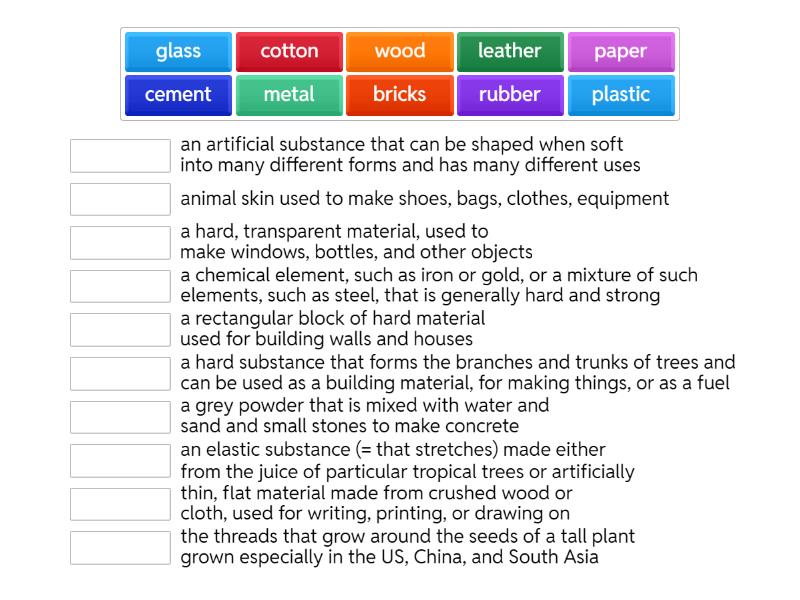 bricks - a rectangular block of hard material used for building walls and houses, cement - a grey powder that is mixed with water and sand and small stones to make concrete, cotton - the threads that grow around the seeds of a tall plant grown especially in the US, China, and South Asia, glass - a hard, transparent material, used to make windows, bottles, and other objects, leather - animal skin used to make shoes, bags, clothes, equipment, metal - a chemical element, such as iron or gold, or a mixture of such elements, such as steel, that is generally hard and strong, paper - thin, flat material made from crushed wood or cloth, used for writing, printing, or drawing on, plastic - an artificial substance that can be shaped when soft into many different forms and has many different uses, rubber - an elastic substance (= that stretches) made either from the juice of particular tropical trees or artificially, wood - a hard substance that forms the branches and trunks of trees and can be used as a building material, for making things, or as a fuel,