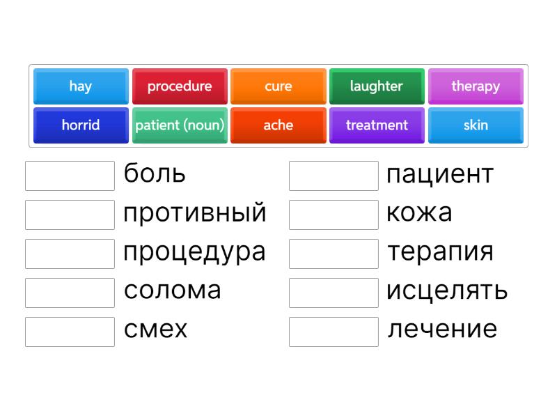 therapy - терапия, skin - кожа, hay - солома, laughter - смех, treatment - лечение, cure - исцелять, ache - боль, patient (noun) - пациент, procedure - процедура, horrid - противный,