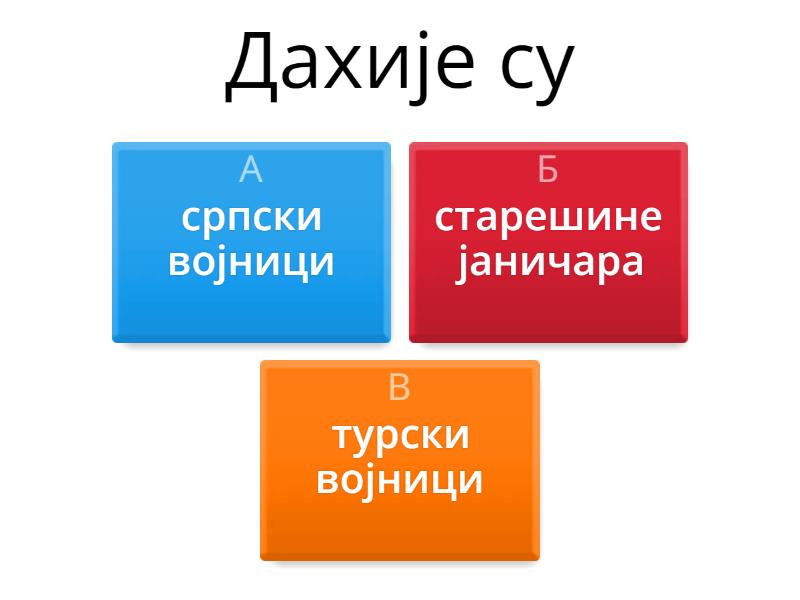 1) Дахије су a) српски војници b) старешине јаничара c) турски војници 2) Који догађај је претходио Првом српском устанку? a) сеча кнезова b) Велика сеоба Срба c) Бој на Косову 3) Ко је изабран за вођу Првог српског устанка? a) Милош Обилић b) Милош Обреновић c) Ђорђе Петровић 4) Које године је подигнут Први српски устанак? a) 1804. b) 1805. c) 1813. 5) У ком месту је подигнут устанак? a) у Такову b) у Орашцу c) у Делиграду 6) 1809. Срби су доживели пораз. Која битка је у питању: a) на Љубићу b) на Иванковцу c) на Мишару d) на Чегру e) на Делиграду 7) 1809. Стеван Синђелић је пуцао у складиште барута. Која битка је у питању? a) Бој на Мишару b) Бој на Чегру c) Бој на Делиграду 8) На слици је: a) Хајдук Стари Вујадин b) Марко Краљевић c) Хајдук Вељко Петровић 9) Први српски устанак је завршен: a) 1812. b) 1814. c) 1813. 10) Да ли је у потпуности успео Први српски устанак? a) не b) да 11) Ћеле-кула ( „кула од лобања“) споменик је из Првог српског устанка који је у знак одмазде тадашња турска власт у Србији изградила од лобања, погинулих српских ратника, предвођених Стеваном Синђелићем, у бици на Чегру. Налази се на уласку у: a) Параћин b) Ниш c) Београд 12) Ко је харамбаша? a) вођа устанка b) вођа турске војске c) најугледнији хајдук 13) Хајдуци су ратовали: a) лети b) зими c) пролеће d) од пролећа до јесени 14) Хајдучки састанак је на a) Митровдан b) Ђурђевдан c) Петровдан d) Јовандан 15) Хајдучки растанак је на a) Митровдан b) Ђурђевдан c) Петровдан d) Јовандан 16) Хајдуке су помагали и зими чували a) дахије b) харамбаше c) јаничари d) јатаци