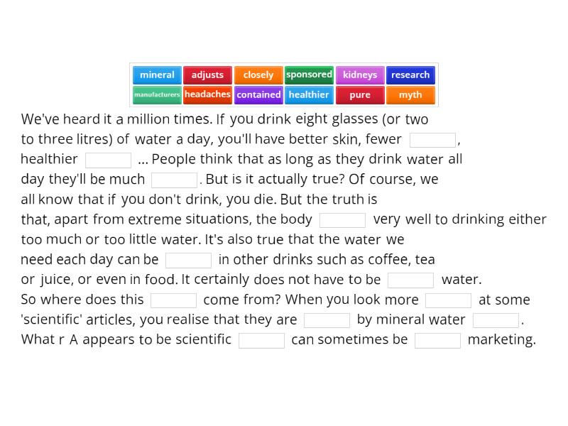 We've heard it a million times. If you drink eight glasses (or two to three litres) of water a day, you'll have better skin, fewer ____, healthier ____ ... People think that as long as they drink water all day they'll be much ____. But is it actually true? Of course, we all know that if you don't drink, you die. But the truth is that, apart from extreme situations, the body ____ very well to drinking either too much or too little water. It's also true that the water we need each day can be ____ in other drinks such as coffee, tea or juice, or even in food. It certainly does not have to be ____ water. So where does this ____ come from? When you look more ____ at some 'scientific' articles, you realise that they are ____ by mineral water ____. What r A appears to be scientific ____ can sometimes be ____ marketing. If you sit at home watching TV all the time the ____ of exercise could ____ your risk of heart ____. But new ____ has discovered that the type of programme you watch also makes a difference to your ____. A team at Cornell University had three groups of ____. Some watched an action film. others watched the same action film but without sound, and the third group watched a talk show. Some had healthy ____ in front of them, and others had snacks ____ in salt and sugar. The result? The volunteers watching the action film with sound ate 98% more than those watching the talk show. Even those watching the action film without sound ate 36% more! It ____ that faster programmes make you eat faster and pay less ____ to how much food you're eating. Interestingly, the ____ who had healthy snacks also ate more. So next time you watch an action film, put away the snacks! If you dropped a heavy object on your big toe, you probably wouldn't enjoy the ____. Pain is not something most of us like feeling. But the ____, not feeling any pain, is much, much worse. Steven Pete was born with a rare genetic ____ which means he cannot feel ____. When he was a boy he ____ his leg while roller skating. He only found out when somebody saw him and told him. The problem is that unless we ____ pain, we don't pay ____ to our body and what hurts us. Pain ____ us from injuring a body part even more. If it didn't hurt to walk on a broken leg or a sprained ____, we would keep using it and cause more damage. If your throat is really ____, you'll probably go to the doctor, who can treat the ____ before it becomes serious. As an adult, Steven Pete will have to have regular ____ in case he becomes dangerously ill without knowing it. So, the next time you go 'ouch', just remember how lucky you are. The scientific term is 'sphenopalatine ganglioneuralgia , but we usually just call it ____ freezes. Brain freeze is when you eat ice cream too quickly and you get a short, sharp pain in your ____. There is a rapid change of temperature at the back of your throat, close to two important ____ which feed ____ to the brain. The brain doesn't like things e to change. Brain freeze is a mechanism to prevent that from happening. The brain can't actually feel ____ despite its billions of ____. But the pain associated with brain freeze is sensed by ____ where the two arteries meet. Analysing brain freeze may seem like silly science to some, but it can help ____ understand other types of ____. And the ____ for brain freeze? Provided you don't eat your ice cream quickly, you'll be fine. You can also put your ____ up to the roof of your mouth or drink something neither hot nor cold to normalise the temperature in your ____.