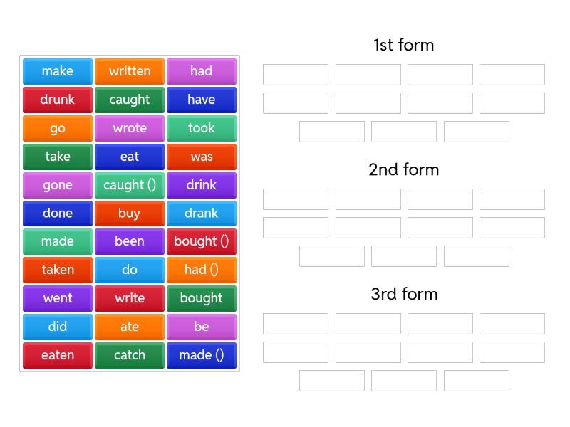 1st form: go, make, take, have, buy, drink, eat, write, do, be, catch, 2nd form: went, made, took, had, bought, drank, ate, wrote, did, was, caught, 3rd form: gone, made (), taken, had (), bought (), drunk, eaten, written, done, been, caught (),