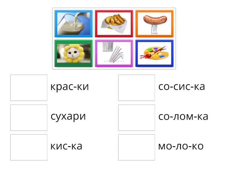 со-сис-ка, мо-ло-ко, со-лом-ка, сухари, крас-ки, кис-ка,