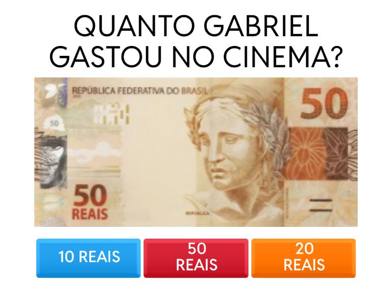 1) QUANTO GABRIEL GASTOU NO CINEMA? a) 10 REAIS b) 50 REAIS c) 20 REAIS 2) QUANTOS REAIS SOFIA GANHOU DE SUA AVÓ? a) 30 REAIS b) 40 REAIS c) 60 REAIS 3) QUANTO LUIZ BESSA PAGOU PELAS CARTAS POKEMÓN? a) 24 REAIS b) 14 REAIS c) 22 REAIS 4) QUAL É O BRINQUEDO MAIS BARATO DA GIOVANNA? a) 45 REAIS b) 51 REAIS c) 39 REAIS 5) QUAL É O BRINQUEDO MAIS CARO DO LÉO? a) 65 REAIS b) 58 REAIS c) 71 REAIS 6) QUEM TEM O MAIOR VALOR EM DINHEIRO? a) VALENTINA b) PAOLA c) MALU 7) EVA COMPROU UM SORVETE POR 15 REAIS E PAGOU COM ESTA CÉDULA. QUANTO ELA RECEBEU DE TROCO? a) b) c) 8) QUAL BRINQUEDO EDU PODE COMPRAR COM ESSAS CÉDULAS? a) 24 REAIS b) 41 REAIS c) 26 REAIS 9) QUEM GASTOU MAIS NA PAPELARIA? a) ISABELA b) MARTINA c) ALISSA 10) JAQUE COMPROU UMA BEBIDA E UM SALGADO NA CANTINA E PAGOU COM ESSAS CÉDULAS. QUAIS ALIMENTOS COMPROU? a) 7 REAIS b) 8 REAIS c) 6 REAIS d) 12 REAIS e) 4 REAIS f) 6 REAIS 11) COM ESSE VALOR, QUAL JOGO DANI PODE COMPRAR? a) 80 REAIS b) 73 REAIS c) 60 REAIS 12) CECÍLIA COMPROU UM PRESENTE PARA ALICE E PAGOU COM ESSAS CÉDULAS. QUANTO ELA GASTOU? a) R $ 10,00 b) R $ 15,00 c) R $ 25,00 d) R $ 22,00 e) R $ 32,00 f) R $ 20,00 13) MANU COMPROU UM CADERNO DA ESCOLA CLÁRITAS E PAGOU COM ESSAS CÉDULAS. QUANTO GASTOU? a) R $ 12,00 b) R $ 10,00 c) R $ 14,00 d) R $ 22,00 e) R$26,00 f) R $ 20,00 14) QUAL FOI O JOGO DE MAIS VALOR QUE MALU COMPROU? a) R $ 56,00 b) R $39,00 c) R $ 51,00 d) R $64,00 15) GIOVANNA GANHOU ESSE VALOR DE MESADA DO AVÔ. QUANTO SERÁ QUE ELE DEU? a) R $ 140,00 b) R $ 120,00 c) R $ 160,00 d) R $ 180,00 e) R $ 170,00 f) R $ 110,00 16) GABI FOI AO MERCADO E COMPROU ESSES PRODUTOS. QUAL FOI O PRODUTO MAIS CARO? a) R $ 8,00 b) R $ 6,00 c) R $ 5,00 d) R $ 3,00 e) R $ 9,00 f) R $11,00