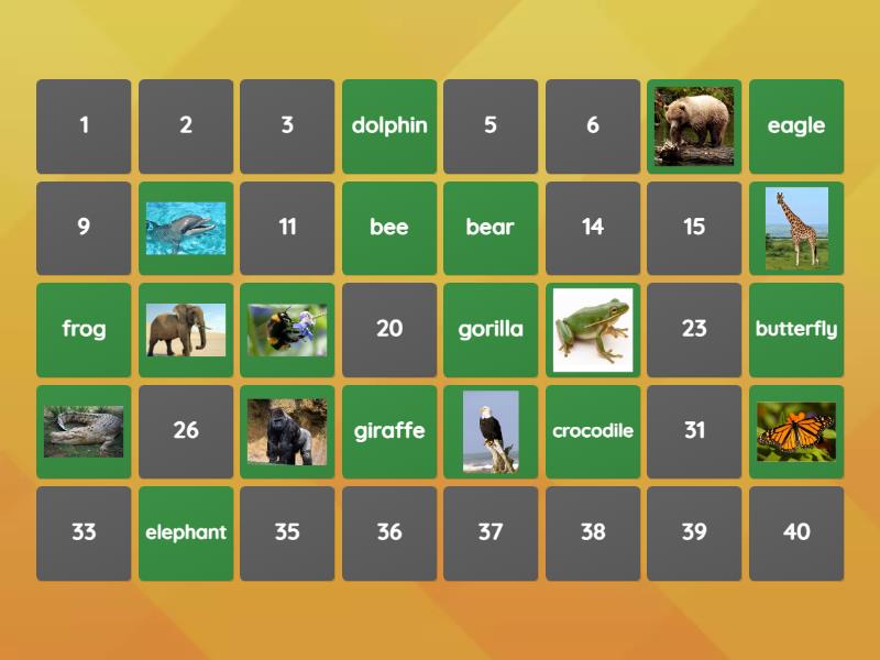 bee, bear, butterfly, crocodile, dolphin, eagle, elephant, frog, giraffe, gorilla, hippo, kangaroo, lion, monkey, shark, snake, spider, tiger, whale, wolf,